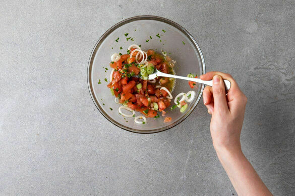 Die Tomatenwürfel und die Lauchzwiebeln mit 1EL Olivenöl und 1EL Balsamicoessig vermengen, die Salsa mit Salz und Pfeffer abschmecken.