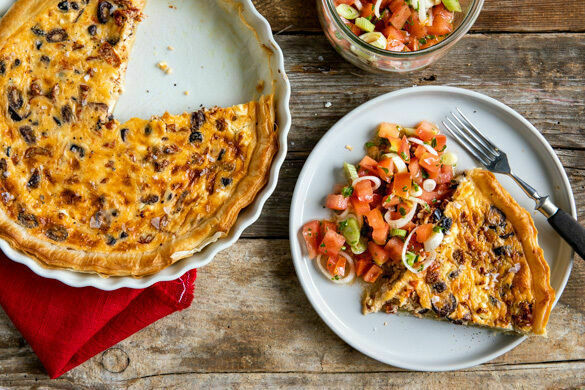 Diese Quiche war der Hit in unserer Testküche – nicht viel Aufwand und soooo, soooo lecker! Die cremige Eiermischung mit Fetakäse, getrockneten Tomaten, kräftig-aromatischen Oliven und einem Hauch würzigen Thymian schmeckt auf der Zunge eindeutig nach Sonne! Mit frischer Tomatensalsa und Basilikum garniert ist dieses Genießerstück eine wahrhaft runde Angelegenheit und fast schon wie ein kleiner Sommerurlaub ...
