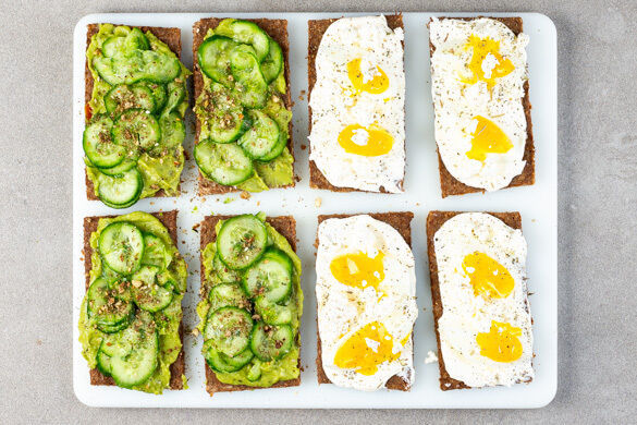 Vermisst du es auch, das Reisen? Keine Sorge, hier kommt ein kleiner Tagtraum für dich, denn mit unserem Frühstücksspecial fantasierst du dich ganz leicht in ferne Gefilde! Inspiriert vom skandinavischen Smörrebröd gibt es zweierlei Schnittchen für deine herzhafte Brunch-Einlage: einmal gekochtes Ei mit Feta auf frisch-cremigem Grund sowie die farbenfrohe Kombi aus Guacamole und süßsauer eingelegter Gurke. Herrlich!