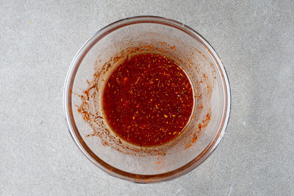 4EL Honig, 2EL Essig, die restliche Gewürzmischung und 1 Prise Salz verrühren.
