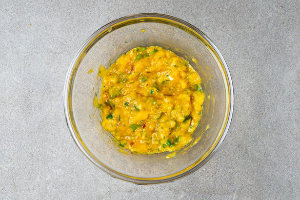 Den restlichen Koriander mit der Mangosalsa vermischen. Den Schweinebauch auf dem Blumenkohlreis anrichten und mit der Mangosalsa garniert servieren, die Limettenspalten dazu reichen.
