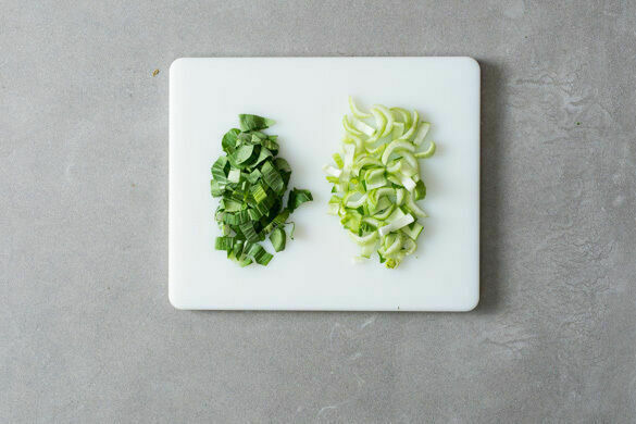 In einem kleinen Topf 300ml leicht gesalzenes Wasser zum Kochen bringen. Den grünen und den weißen Teil des Pak Choi getrennt in Streifen schneiden. Den Knoblauch schälen und fein würfeln oder reiben.