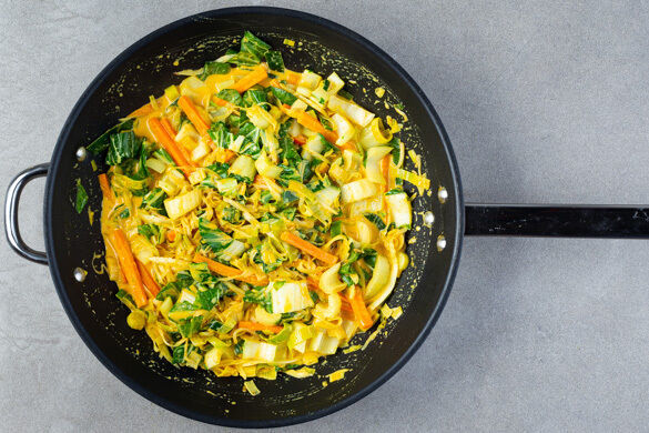 1EL Currypaste in einer großen Pfanne mit 1–2TL Pflanzenöl bei mittlerer Hitze ca. 1Min. anbraten. Den Knoblauch hinzufügen und ca. 30Sek. mitbraten. Den weißen Pak Choi und den Gemüsemix untermengen und alles weitere 1–2Min. braten.