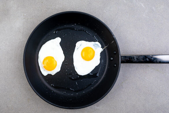 Die Eier in einer mittelgroßen Pfanne mit 1EL Pflanzenöl bei mittlerer Hitze 3–5Min. braten, bis das Eiweiß fest, das Eigelb aber noch leicht flüssig ist. Tipp: Wer das Eigelb lieber fest mag, wendet die Eier nach der Hälfte der Zeit oder verwendet zusätzlich einen Deckel.