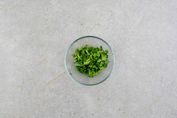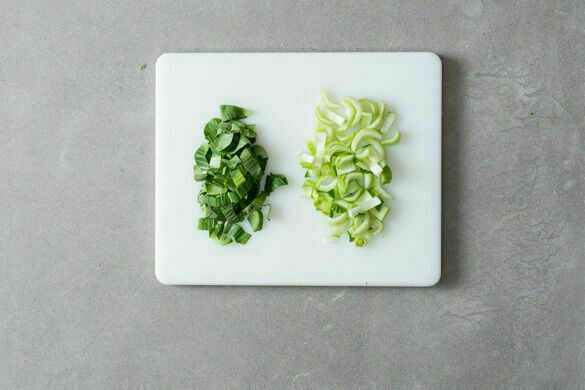 In einem mittelgroßen Topf 600ml leicht gesalzenes Wasser zum Kochen bringen. Den grünen und den weißen Teil des Pak Choi getrennt in Streifen schneiden. Den Knoblauch schälen und fein würfeln oder reiben.