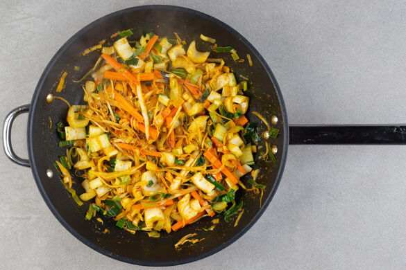 2EL Currypaste in einer großen Pfanne mit 1EL Pflanzenöl bei mittlerer Hitze ca. 1Min. anbraten. Den Knoblauch hinzufügen und ca. 30Sek. mitbraten. Den weißen Pak Choi und den Gemüsemix untermengen und alles weitere 1–2Min. braten.