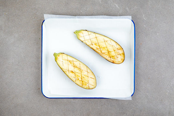 Den Backofen auf 220°C (200°C Umluft) vorheizen. Die Auberginen längs halbieren und kreuzweise einschneiden, ohne die Schale zu verletzen. Die Schnittflächen mit 1–2TL Olivenöl und 1 Prise Salz einreiben. Die Auberginen mit der Schnittfläche nach oben auf einem mit Backpapier ausgelegten Backblech im Ofen 25–30Min. rösten, bis sie weich sind.