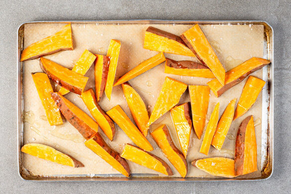 Den Backofen auf 220°C (200°C Umluft) vorheizen. Die Süßkartoffel der Länge nach halbieren und in ca. 2cm dicke Spalten schneiden, dann mit 1/2TL Salz sowie 1EL Olivenöl vermengen und auf einem mit Backpapier ausgelegten Backblech verteilen. Die Süßkartoffeln im Ofen 25–30Min. goldbraun backen.