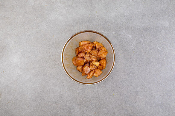 Die Limettenschale abreiben, die Limette halbieren und auspressen. Das Fleisch trocken tupfen, in ca. 2cm große Würfel schneiden und mit der Limettenschale, dem Limettensaft, 1/2TL Kreuzkümmel, 1/2TL Chiliflocken oder mehr nach Geschmack, 1/2TL Salz sowie 1EL Olivenöl vermengen und beiseitestellen. Die Zwiebel schälen, halbieren und eine Hälfte fein würfeln.