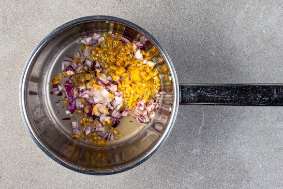 Die Passionsfrucht halbieren, das Fruchtfleisch samt Kernen mit einem Löffel auskratzen und mit den Zwiebelwürfeln, 1 kräftigen Prise Kreuzkümmel, 1TL Zucker, 1TL Essig, 2–3EL Wasser und 1 kräftigen Prise Salz in einem kleinen Topf mit 1TL Olivenöl bei mittlerer Hitze abgedeckt 7–10Min. köcheln lassen, bis das Chutney eingedickt ist und eine marmeladenartige Konsistenz hat.