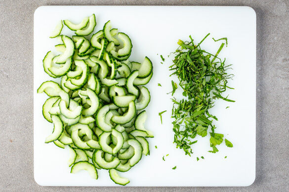 Die Gurke längs halbieren und nach Belieben mit einem Löffel die Kerne auskratzen. Die Gurke quer in dünne Scheiben schneiden. Die Minzeblätter von den Stängeln zupfen und grob schneiden. Den Koriander samt Stängeln ebenfalls grob schneiden.