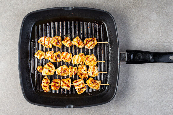 Das Fleisch auf die Holzspieße ziehen. Die Spieße in einer großen Grillpfanne oder auf einem Grill bei starker Hitze auf jeder Seite 3–4Min. braten, bis das Fleisch gar und goldbraun ist.