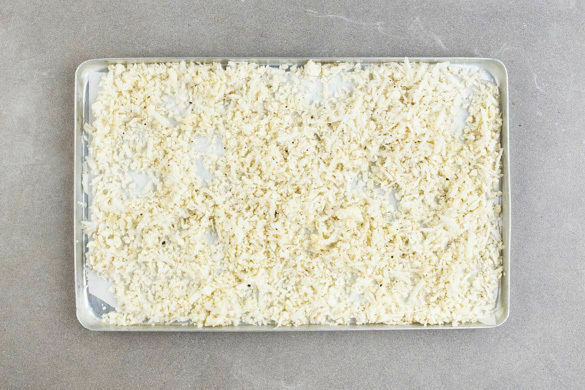 Den Blumenkohl mit einer Küchenreibe grob raspeln und auf einem mit Backpapier ausgelegten Backblech verteilen. Mit 2EL Olivenöl sowie je 1 kräftigen Prise Salz und Pfeffer vermengen und in den letzten ca. 8Min. zu dem Fleisch und den Linsen in den Ofen geben und backen, bis der Blumenkohlreis gar und leicht gebräunt ist.