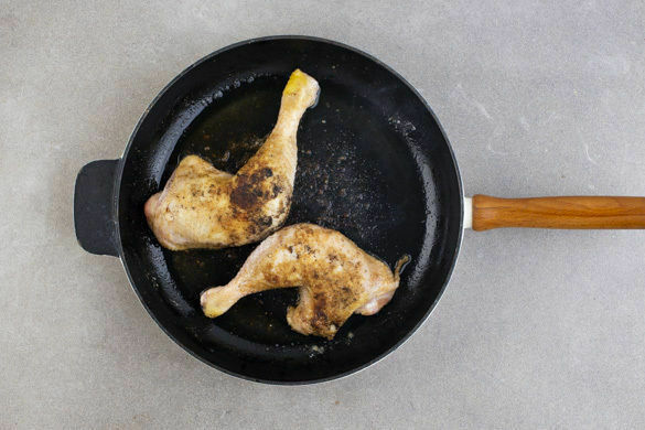 Das Fleisch trocken tupfen, mit etwas Kreuzkümmel, Salz und Pfeffer einreiben und in 3–4EL Mehl wenden. Anschließend in einer großen, ofenfesten Pfanne mit 3EL Olivenöl bei starker Hitze 3–4Min. rundum knusprig anbraten, dann auf einem Teller beiseitestellen. Tipp: Wer keine ofenfeste Pfanne hat, kann im nächsten Schritt nach dem Anbraten auch alles in eine Auflaufform geben.