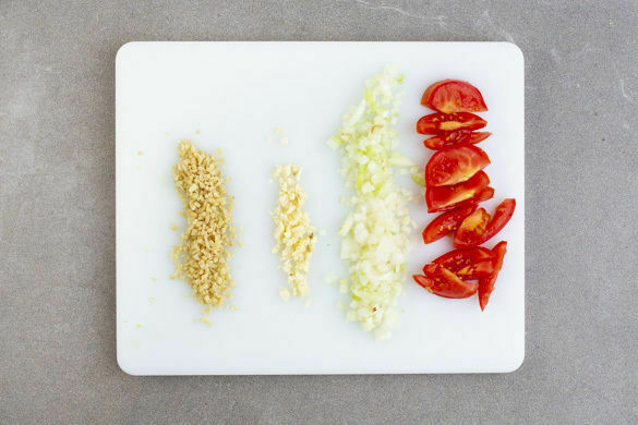 Den Backofen auf 220°C (200°C Umluft) vorheizen. Die Zwiebeln und den Knoblauch schälen und fein würfeln. Den Ingwer schälen und ebenfalls fein würfeln. Die Tomaten in dünne Spalten schneiden.