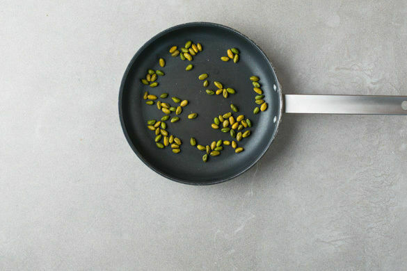 Die Pistazien in einer kleinen Pfanne ohne Zugabe von Fett bei mittlerer Hitze 1–2Min. anrösten. Aus der Pfanne nehmen, etwas abkühlen lassen, dann grob hacken.