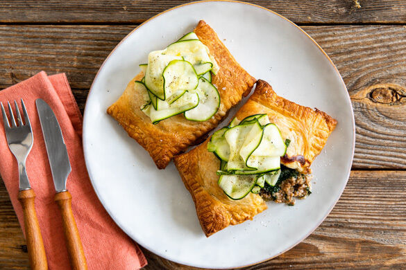 Spanakopita – ein Liebling der griechischen Küche! Traditionell werden die herzhaft gefüllten Päckchen aus einem hauchdünnen Teig gemacht, der im knusprigen Kontrast zur saftigen Füllung steht. In unsere kleinen Genussbeutel packen wir heute eine würzig-saftige Füllung aus Spinat und Rinder- und Schweinehack. Ohne viel Aufwand servierst du als elegante Begleitung mit Minze und Zitrone verfeinerte Zucchinistreifen. Köstlich!