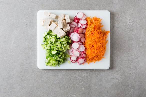 Die Karotten ggf. schälen und grob reiben. Die Radieschen in dünne Scheiben schneiden. Die Lauchzwiebeln in feine Ringe schneiden. Die Gurke längs halbieren und quer in dünne Scheiben schneiden. Den Tofu mit Küchenkrepp trocken tupfen.
