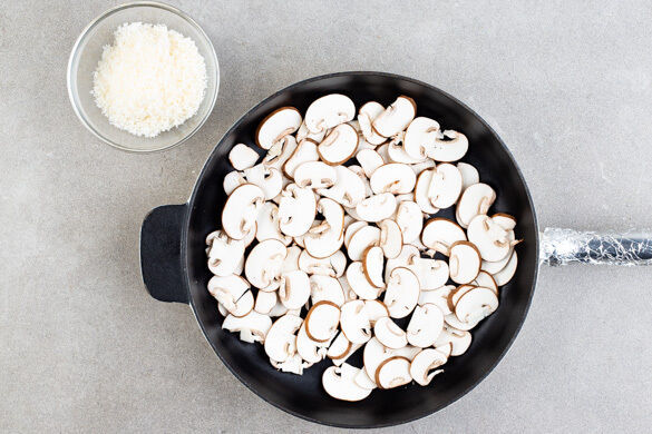 Die Pilze in einer großen, ofenfesten Pfanne ohne Zugabe von Fett bei starker Hitze ca. 5Min. anbraten, dabei nicht zu häufig rühren. Den Käse fein reiben.