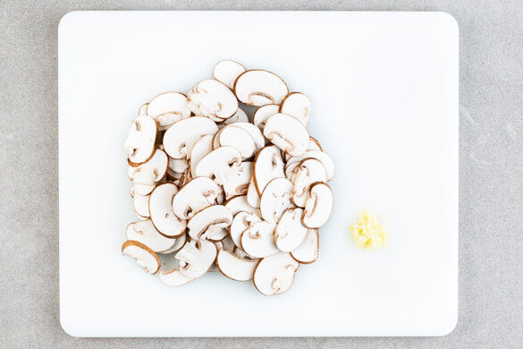 Den Backofen mit Grillfunktion oder Ober-/Unterhitze auf 250°C vorheizen. In einem mittelgroßen Topf ausreichend gesalzenes Wasser für die Tortelloni zum Kochen bringen. Die Pilze ggf. säubern und in dünne Scheiben schneiden. Den Knoblauch schälen und durch eine Knoblauchpresse drücken oder sehr fein würfeln.