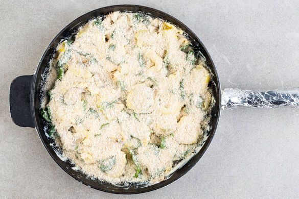 Die Käse-Brösel-Mischung gleichmäßig auf den Tortelloni verteilen und die Tortelloni 3–5Min. goldbraun überbacken. Auf Teller verteilen und servieren.