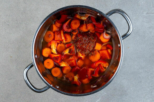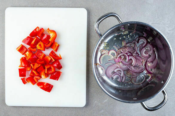 Die Zwiebeln in einem großen Topf mit 2EL Olivenöl bei mittlerer Hitze ca. 3Min. anschwitzen. Die Paprika vierteln, entkernen und in 1–2cm große Stücke schneiden.