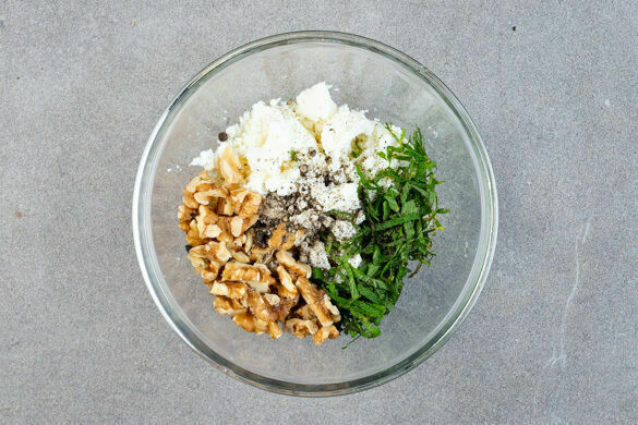 Den Feta mit den Fingern oder einer Gabel zerkrümeln. Die Minzeblätter von den Stängeln zupfen und grob schneiden. Die Walnüsse grob hacken und mit dem Feta, der Minze und 1 Prise Pfeffer vermengen. Tipp: Wer mag, kann die Walnüsse zuvor in einer Pfanne ohne Zugabe von Fett bei mittlerer Hitze 1–2Min. anrösten. Vorsicht, sie können schnell zu dunkel werden.