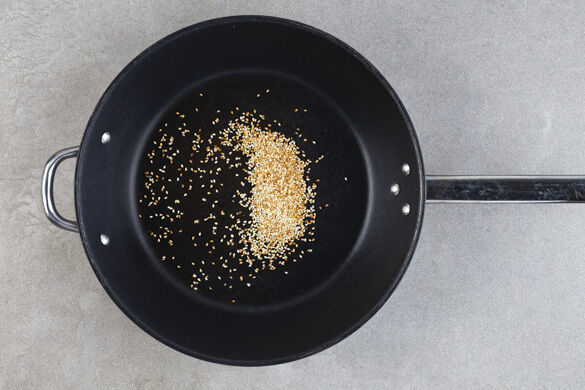 Den Sesam in einer großen Pfanne ohne Zugabe von Fett bei mittlerer Hitze 1–2Min. goldbraun anrösten. Vorsicht, der Sesam kann schnell zu dunkel werden. Zum Abkühlen aus der Pfanne nehmen und beiseitestellen.