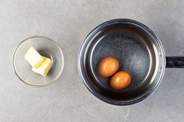 In einem kleinen Topf ausreichend Wasser für die Eier zum Kochen bringen. 2EL Butter in eine kleine Schüssel geben und bei Zimmertemperatur weich werden lassen. Die Eier 6Min. sanft köcheln lassen, dann kalt abschrecken, schälen und jedes Ei vierteln. Tipp: Wer hart gekochte Eier bevorzugt, lässt sie 10Min. köcheln.