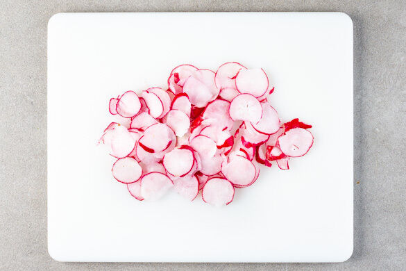Die 1/2 der Radieschen in feine Scheiben hobeln. Die übrigen Radieschen werden für dieses Rezept nicht benötigt.