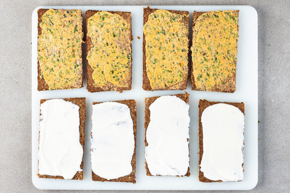 Den fein geschnittenen Kerbel, die 1/2 des Schnittlauchs und 1TL Bratkartoffelgewürz gründlich mit der weichen Butter vermengen, dann 4 Scheiben Brot mit der Kräuterbutter bestreichen. Weitere 4 Scheiben Brot mit der Crème fraîche bestreichen.