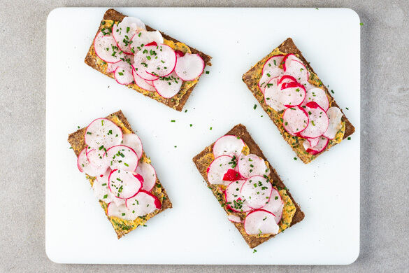 Die Kräuterbutter-Brote mit den Radieschen belegen, mit dem restlichen Schnittlauch garnieren und mit 1 Prise Pfeffer würzen.