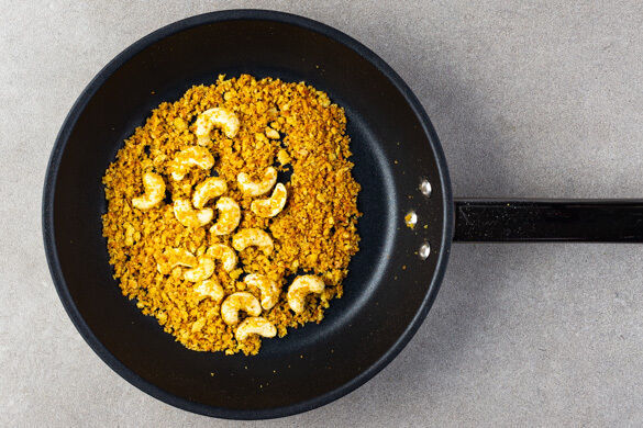 Das Panko-Paniermehl, das übrige Currypulver und die restlichen Cashews mit 1–2EL Pflanzenöl und 1 kräftigen Prise Salz in einer kleinen Pfanne bei mittlerer Hitze 3–5Min. knusprig anrösten, dabei gut umrühren. Die Gurken abgießen. Den Reis und das Curry auf tiefe Teller verteilen, die Gurken darauf anrichten und mit dem Panko-Cashew-Crunch garniert servieren.