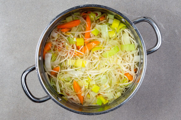 Die 1/2 der Nudeln und den Gemüsemix in das kochende Wasser geben und 5–6Min. köcheln lassen, dabei regelmäßig umrühren. Tipp: Wer großen Hunger hat, kann auch mehr Nudeln verwenden.