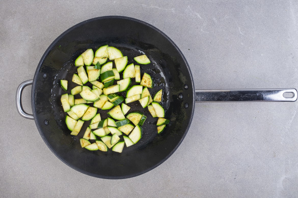 Die Zucchini in einer großen Pfanne mit 1–2EL Olivenöl bei starker Hitze ca. 2Min. anbraten.