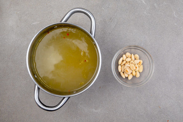 Das Brühgewürz im kochenden Wasser auflösen, dann den Bulgur unterrühren und in 8–10Min. bissfest kochen. In ein Sieb abgießen und abtropfen lassen. Die Mandeln in einer kleinen Pfanne ohne Zugabe von Fett bei mittlerer Hitze 2–3Min. goldbraun anrösten. Vorsicht, sie können schnell zu dunkel werden. Zum Abkühlen aus der Pfanne nehmen und beiseitestellen.