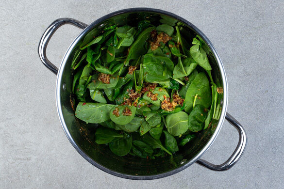 Die 1/2 der Gewürzmischung, den Knoblauch, den Ingwer und 1 kräftige Prise Chiliflocken in einem mittelgroßen Topf mit 2EL Butter bei mittlerer Hitze ca. 1Min. anbraten. Den Spinat portionsweise zugeben und zusammenfallen lassen.