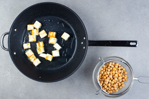 Die Kichererbsen in einem Sieb mit kaltem Wasser abspülen und abtropfen lassen. Den Käse in ca. 1cm große Würfel schneiden und in einer mittelgroßen Pfanne mit 1EL Pflanzenöl und 1 Prise Salz bei starker Hitze ca. 4Min. rundum goldbraun braten. Mit einer Schaumkelle aus der Pfanne nehmen und einige Käsewürfel als Garnitur beiseitelegen, den übrigen Käse in den Spinat einrühren.