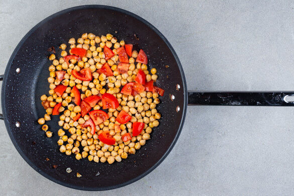 Die Kichererbsen, 3/4 der Tomatenwürfel und 1 Prise Salz in derselben Pfanne bei mittlerer Hitze 3–4Min. erwärmen.