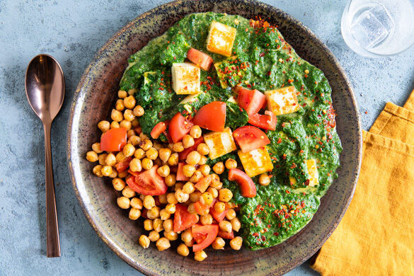 Hier kommt ein Gericht aus der indischen Küche, das mit seinem treuen, tiefen Spinatgrün und seinen herzhaft-herzlichen Paneer-Würfeln, seinen erquickend-fröhlichen Aromen – darunter würziges Garam Masala, frischer Ingwer und scharfe Chili – und den bodenständigen, sättigenden Kichererbsen das ganze Register der Gefühle und natürlich auch Geschmäcker bedient. Wir sind hin und weg!