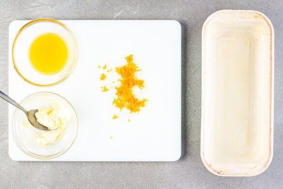 Den Backofen auf 190°C (170°C Umluft) vorheizen. Eine Kastenform mit 1EL Butter fetten und mit 1–2TL Mehl bestäuben. Die Orangenschale abreiben, dann die Orange halbieren und auspressen. 40g Butter Raumtemperatur annehmen lassen.