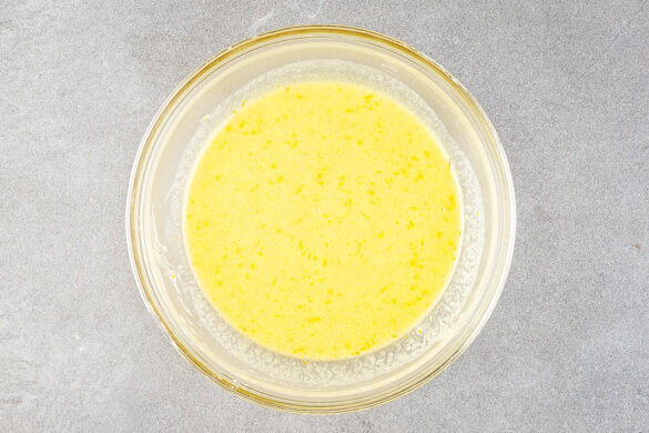 130g Mehl mit 2TL Backpulver in eine Schüssel sieben, 1/2TL Salz untermischen und beiseitestellen. Mit einem Schneebesen 150g Zucker mit der Orangenschale verrühren, bis der Zucker feucht wird. Dann die Eier, den Joghurt, 2EL Orangensaft und 130ml Pflanzenöl zugeben und alles zu einem glatten Teig verrühren.