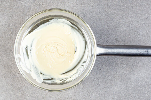 Einen kleinen Topf 3–4 cm hoch mit Wasser füllen und das Wasser zum Kochen bringen. Eine hitzebeständige Schüssel auf den Topf legen und darauf achten, dass sie das Wasser nicht berührt. Die Schokoladenstückchen hinzugeben und rühren, bis die Schokolade vollständig geschmolzen ist. Vom Herd nehmen und abkühlen lassen.