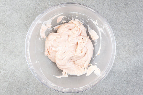Für das Topping den Frischkäse und die bereitgestellten 40g Butter mit einem Handrührgerät cremig aufschlagen, dann 1EL Orangensaft und 1TL Himbeerpulver untermengen. Die Mischung nach und nach in die Schokolade einrühren und luftig aufschlagen.