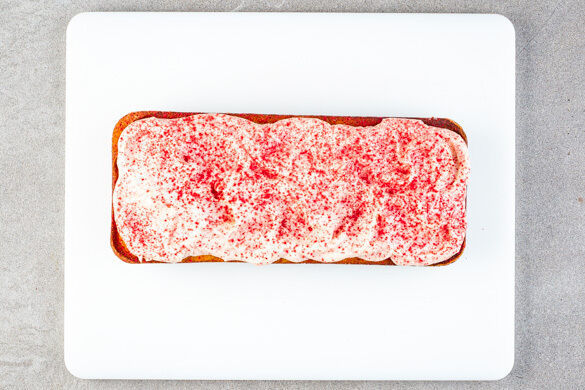 Den Kuchen vollständig auskühlen lassen, dann aus der Form nehmen. Die Oberfläche mit dem Schoko-Frischkäse-Topping bestreichen und nach Belieben das restliche Himbeerpulver darübersieben. Den Kuchen in 8 Scheiben schneiden und servieren.