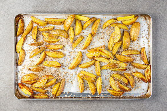 Die Kartoffelspalten mit 1EL Pflanzenöl und je 1 kräftigen Prise Salz und Pfeffer vermengen, auf einem mit Backpapier ausgelegten Backblech verteilen und 25–30Min. im Ofen backen. Den Sesam für die letzten 10Min. Garzeit untermischen.