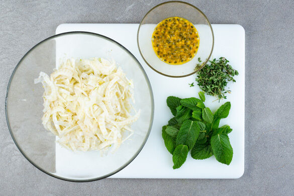 Den Fenchel längs vierteln und quer in hauchdünne Streifen schneiden. Die Passionsfrüchte halbieren und mit einem Löffel auskratzen. Die Zitronenthymianblättchen abstreifen und die Minzeblätter abzupfen.