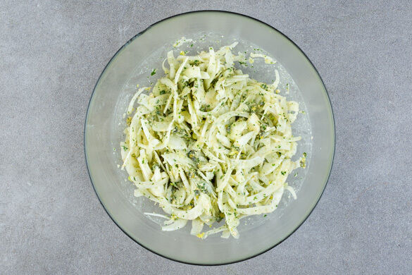 Den Fenchel dazugeben und alles gut vermischen. Den Reissalat mit Salz und Pfeffer abschmecken und mit den gehackten Cashewkernen garniert servieren.