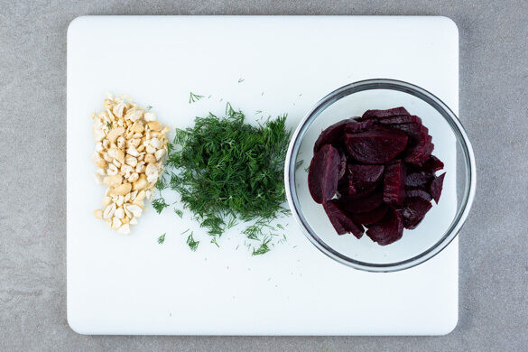 Die Rote Bete halbieren und in dünne Scheiben schneiden. Tipp: Da Rote Bete stark färbt, beim Verarbeiten am besten Küchenhandschuhe und Schürze tragen. Die restlichen Cashewkerne grob hacken. Den Dill samt Stängeln grob schneiden.