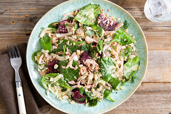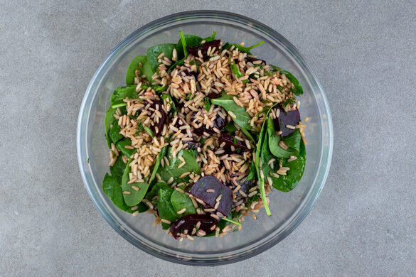 Pastasalat? Kennen wir. Kartoffelsalat? Ein Klassiker, keine Frage. Aber Reissalat? Ja, warum eigentlich nicht? Als Gemüseeinlage passen frischer Spinat, würziger Fenchel, farbenfrohe Rote Bete und ihr bewährter kulinarischer Kumpane, der aromatische Dill, ganz hervorragend zu dem sommerlichen Dressing aus Zitronenthymian und Minze, Cashewnüssen und Passionsfrüchten. Absolut einen Versuch wert!